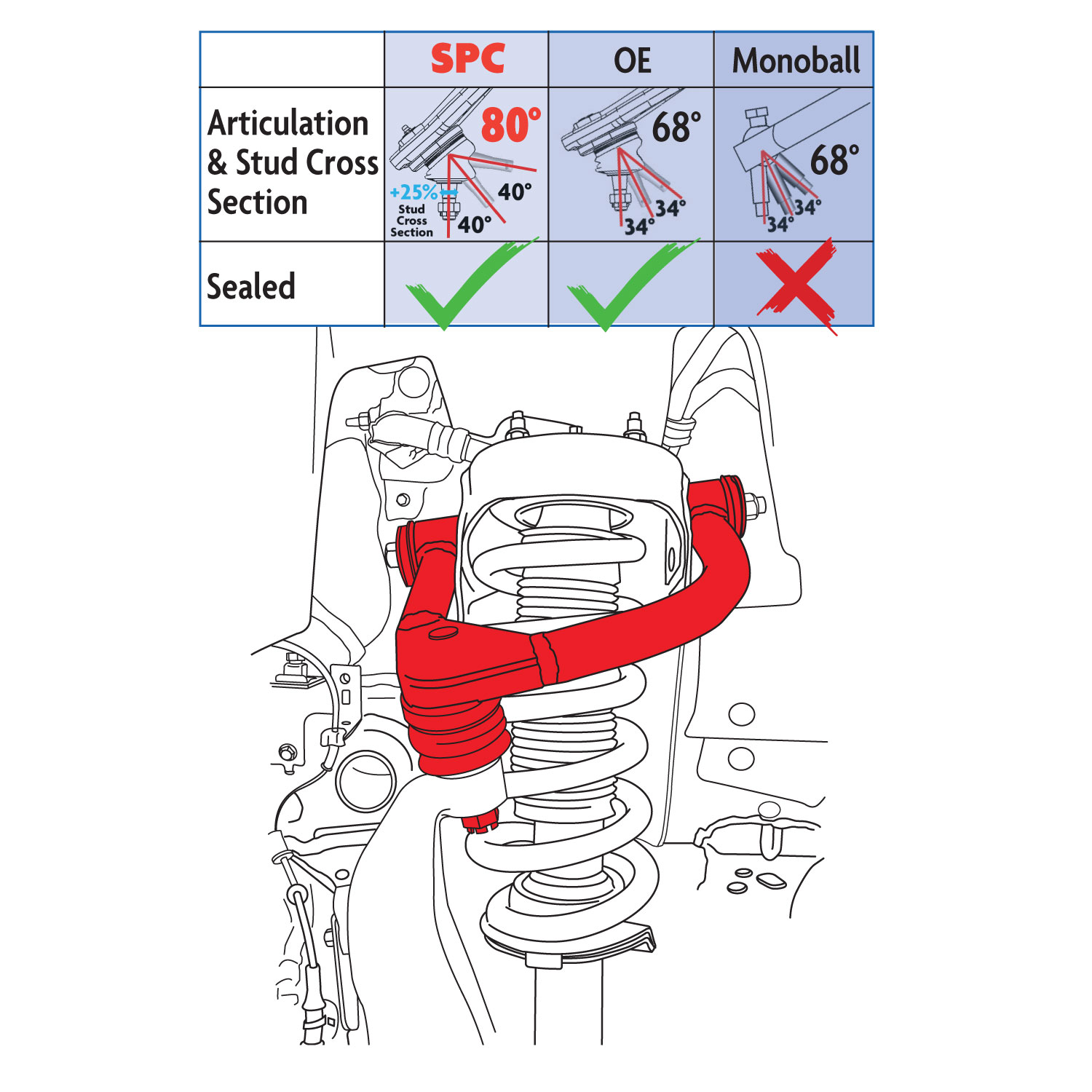 Designed, engineered, tested, and assembled in Colorado, SPC Performance adjustable upper control arms are loaded with impressive features. Improve suspension travel, handling, and tire wear while centering the tire in the wheel well for maximum clearance needed for oversized tires. Now equipped with maintenance-free ball joints and free-pivoting xAxis™ sealed flex joints in bonded rubber sleeves, for correction of alignment angles and restoration of factory ride quality. A tubular steel design provides the strength and durability needed for the most demanding environments. SPC adjustable control arms have improved clearance to get around the spring bucket and a full 80° of articulation in the ball joint. When trucks are lifted, caster and camber angles are affected that can lead to poor handling characteristics such as ‘wandering’. SPC control arms have positive caster built-in for lifted vehicles to restore alignment angles and driveability. The patented ball joint design gives more adjustability than any other arm on the market, use it in combination with cam adjusters on the lower arm to maximize tire clearance and minimize the need for frame mods. Replace OE lower cams with #86220. Sold as pairs. US Patent No. 7,513,514.